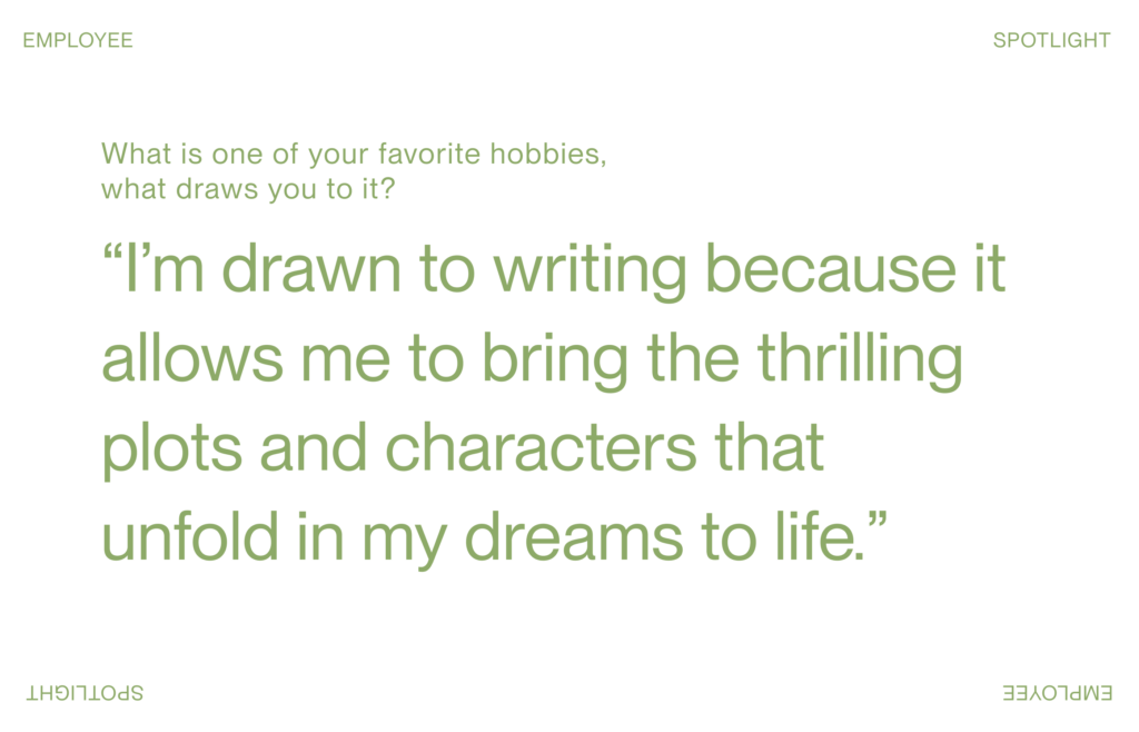 I have a profound affection for writing, and what draws me to it is the ability to bring to life the thrilling plots that normally come from my dreams. As I sit down with pen and paper, I'm transported to a world of limitless possibility, where characters and storylines converge in a swirl of creativity. I find myself lost in the process of crafting a narrative that's both personal and universal, as I strive to capture the essence of those vivid dreams and bring them into the waking world.